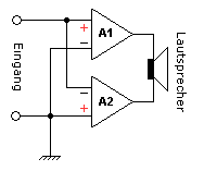 - In einem Vollbrückenverstärker arbeiten zwei Gegentaktverstärker gegeneinander auf jeweils einen der Lastanschlüsse. Der Lautsprecher bildet eine „Brücke“ zwischen beiden Verstärkern. Sie werden eingesetzt, wenn an einer gegebenen Lastimpedanz und bei gegebener Versorgungsspannung möglichst hohe Leistung erzielt werden muss (z.B. Autoradios).