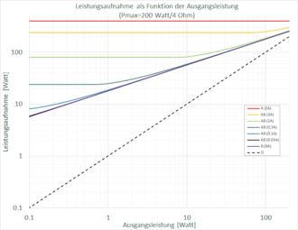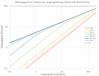 - Gegentaktverstärker Klasse AB: zwei aktive Bauelemente arbeiten in einer Gegentaktschaltung abwechselnd (engl. push-pull). Theoretischer Wirkungsgrad bei Vollaussteuerung: 50 % … 78,5 %.