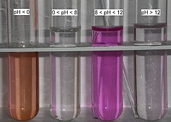 Durch Deprotonierung bei pH > 8 bildet sich aus dem farblosen Phenolphthalein (1) unter Öffnung des Lactonrings das rot gefärbte chinoide Dianion (2), für das sich 2 mesomere Grenzstrukturen formulieren lassen. Bei pH > 12 bildet sich die Hydroxy-substituierte, farblose Triphenylmethan-Verbindung 3. Unter stark sauren Bedingungen wird der Lactonring des Phenolphthaleins geöffnet und unter Wasserabspaltung bildet sich das mesomeriestabilisierte, farbige Kation 4.