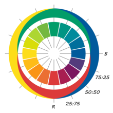 Unterschiede ergeben sich aus den gewählten Primärfarben, die im Farbkreis als Dreieck oder Viereck angeordnet werden. Physikalisch genügen die drei Primärfarben Rotorange, Grün und Blauviolett (RGB, additive Mischung von Lichtfarben). Psychologisch gelten Rot, Gelb, Grün und Blau als Grundfarben. Eine Körperfarbenmischung mit festgelegten Pigmenten lässt sich aus den drei Primärfarben Cyan, Magenta und Gelb (cmy, subtraktive Mischung von Körperfarben) erzielen.