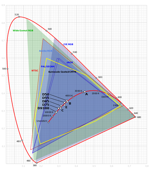 Das farbige Feld des XYZ-Raumes steht für die Menge aller sichtbaren Farben. Das CIE-Normvalenzsystem wird anschaulich durch den Farbkörper nach Rösch wiedergegeben. Über ICC-Profile werden für die Farbeingabe- und Farbausgabegeräte, wie Monitor, Scanner, Drucker, die jeweils notwendigen Farbräume (RGB, CMYK) transformiert. Diese Transformation ist aber nicht eindeutig möglich. Der materiell jeweils realisierbare RGB-Farbraum liegt auf der Farbarttafel, genauer im CIE-Farbraum innerhalb eines Dreiecks. Ein solches Dreieck ist in der nebenstehenden Darstellung schwarz umrandet. Durch unterschiedliche Umformungen (meist als 3×3-Matrix) der Zahlenwerte und mittlerweile bessere technische Verfügbarkeit gibt es unterschiedlich definierte und normierte Varianten (s-RGB, Adobe-RGB, Bruce-RGB).