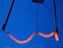 Das Bild zeigt die Glühwendel als Doppelwendel in einer Glühlampe für Netzspannung bei reduzierter Spannung. Gut zu sehen sind die Wärmeverluste am Zuleitungsdraht und – deutlich geringer – an den Ösen des Haltedrahtes.