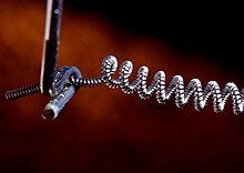 Durchgebrannte Wendel einer HB4-Autoglühlampe (Länge der Wendel: ca. 6 mm)