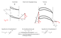 Y ist hier die spezifische Schaufelarbeit, u die Umfangsgeschwindigkeit der sich drehenden Schaufelspitze am Eintritt (Index 1) und Austritt (Index 2), desgleichen die nutzbare Fluidgeschwindigkeit cu am Ein- und Austritt.