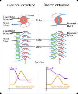 Sind Turbinen in einem durchströmten Gehäuse montiert, befindet sich vor jeder Laufradstufe ein Leitrad. Diese Leitschaufeln ragen vom Gehäuse in das strömende Medium hinein und versetzen es in einen Drall. Der im Leitrad erzeugte Drall (kinetische Energie) wird im darauffolgenden Laufrad genutzt, um die Welle, auf der die Laufradschaufeln über die Nabe montiert sind, in Rotation zu versetzen. Diese Rotation kann genutzt werden, um zum Beispiel einen Generator anzutreiben. Leitrad und Laufrad zusammen bezeichnet man als Stufe. Oft sind mehrere solcher Stufen hintereinandergeschaltet. Da das Leitrad stillsteht, können seine Leitschaufeln sowohl am Gehäuseinneren als auch am Gehäuseäußeren befestigt sein, und somit für die Welle des Laufrads ein Lager anbinden. Bei der mit Wasserdampf angetriebenen Ljungströmturbine drehen aufeinanderfolgende Laufschaufeln in entgegengesetzte Richtung, deshalb brauchen sie keine Leitbeschaufelung.
