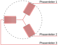 Die Wirkung der drei Spulen lässt sich vervielfachen, indem sie jeweils paarig gegenüberliegend und in größerer Zahl über den Umfang des Statorkörpers verteilt werden. Wird jedes Spulenpaar direkt von dem Dreiphasenstrom mit der Netzfrequenz f gespeist, so ergibt sich dabei keine Drehzahlveränderung. Werden jedoch jeweils mehrere Spulenpaare für jede der drei Stromphasen hintereinandergeschaltet und jeweils gleichmäßig über den Statorumfang verteilt, wird dadurch die Drehzahl n des resultierenden Statormagnetfeldes entsprechend der beteiligten Spulenpaarzahl p verkleinert.