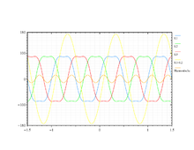 zwischen den Drehstromphasen ist die dritte Oberschwingung (orange dargestellt)