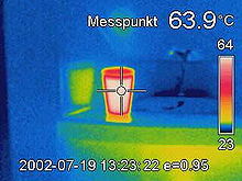 - Thermografie: berührungslose Flächen-Temperaturmessung mit Infrarotstrahlung. „Wärmebild“ in Hell-Dunkel Darstellung oder in Farben (siehe Bild)