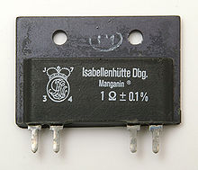 Der Begriff Shunt hat sich weiterentwickelt und bezeichnet auch einen Strommesswiderstand,[3][4][5] das ist ein niederohmiger elektrischer Messwiderstand, vielfach ausgestattet mit getrennten Strom- und Spannungsklemmen. Dieser wird unmittelbar in die stromführende Leitung eingefügt. Durch das zu dieser Art von Shunt parallelgeschaltete Spannungsmessgerät wird nur ein meistens vernachlässigbar kleiner Strom abgeleitet.