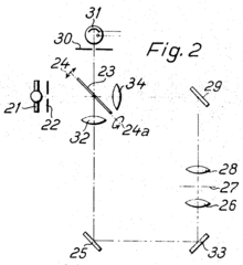 ![]() ![]() Weber’sche Varianten mit Kippspiegel, oben: Durchlicht. Von der Lichtquelle (21) geht es durch die