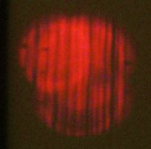 Das AF-Hilfslicht ist meist rot oder – z.B. bei der Pentax K-5 – grün (sichtbar), alternativ infrarot (unsichtbar), in letzterem Fall dann allerdings durch Längs-CA des Objektivs auch etwas ungenauer. Wie im Bildbeispiel zu sehen, kommt dabei idealerweise kein gleichmäßiger Lichtfleck zum Einsatz, sondern ein auf das Motiv projiziertes Muster. Wenn der Phasenvergleich in der Horizontalen gemessen wird, eignet sich ein vertikales Linienmuster besonders gut. Größter Vorteil allerdings ist, dass mit solch einem Beleuchtungsmuster sogar auf Flächen ohne jeden Kontrast fokussiert werden kann, weshalb man dieses Verfahren auch dann verwendet, wenn das Objekt eigentlich genügend Licht für die Messung liefert, jedoch zu geringen Kontrast aufweist. Verfügt die Kamera über kein eigenes Blitzlicht, ist das AF-Hilfslicht meist im zugehörigen Blitzgerät eingebaut.