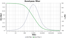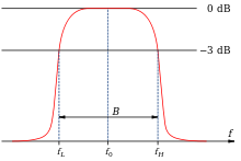 Der Durchlassbereich, welcher aus der Übertragungsfunktion ersichtlich ist, ist durch eine Bandbreite B um die Mittenfrequenz f0 charakterisiert. Die Mittenfrequenz wird auch als Resonanzfrequenz bezeichnet und ist definiert als das geometrische Mittel von fH und fL:
