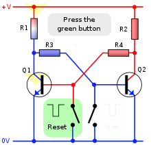 Gemeinsam ist jedoch allen, dass sie zwei stabile Zustände haben, welche an einem Ausgang festgestellt werden können. Diese Zustände werden „gesetzt“ (set) und „zurückgesetzt“ (reset) genannt. Zwischen diesen Zuständen kann durch Signale an den Eingängen umgeschaltet werden. Üblicherweise ist neben dem Ausgang Q ein weiterer Ausgang Q vorhanden, an dem der negierte Wert von Q anliegt. Der Einschaltzustand ist bei einem einfachen Flipflop aus zwei symmetrisch angeordneten bipolaren Transistoren (wie im Bild rechts) nicht definiert. Dieser kann mittels eines Kondensators an einem der beiden Eingänge festgelegt werden.