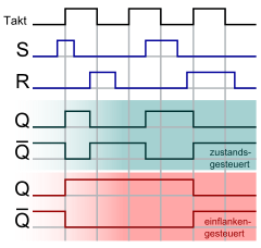 - Taktflankengesteuerte Flipflops können ihren Zustand nur während einer festgelegten Taktflanke ändern. Impulse, die solche Flanken enthalten, können aus den 0-Pegel in den 1-Pegel übergehen und wieder zum 0-Pegel zurückkehren, also mit steigender Flanke beginnen; sie können in anderen Fällen aus dem 1-Pegel in den 0-Pegel übergehen und wieder zurück zum 1-Pegel, also mit fallender Flanke beginnen (wie oben im Bild „Bistabile Transistor-Kippstufe“). Das taktflankengesteuerte Flipflop reagiert nur während einer sehr kurzen Zeit nach der festgelegten Taktflanke auf die Signale, die an den Eingängen anliegen. In der übrigen Zeit bis zur nächsten Flanke in dieselbe Richtung bleibt der vorher eingestellte Zustand gespeichert und ändert sich – im Gegensatz zu zustandsgesteuerten Flipflops – auch dann nicht, wenn sich die Eingangssignale ändern. Es wird unterschieden in einflankengesteuerte Flipflops auf Wechsel bei steigender (positiver) Taktflanke oder bei fallender (negativer) Taktflanke sowie zweiflankengesteuerte (Übernahme am Eingang mit der einen, Ausgabe mit der anderen Taktflanke).
