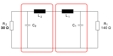 Die Berechnung der Bauelemente erfolgt in zwei Stufen: Der Widerstand R2 wird durch C2 und L2 auf einen sehr geringen Zwischenwert R3 ≈ 1 Ω herabtransformiert, den man sich an der Verbindung der beiden roten Rechtecke denken kann. R3 ist aber nicht als Bauelement vorhanden, sondern dieser fiktive Zwischenwert wird durch C1 und L1 auf den gewünschten Widerstand R1 hochtransformiert. Da beide Resonanztransformatoren hohe Gütefaktoren Q aufweisen, wird die erwünschte Filterwirkung erreicht.