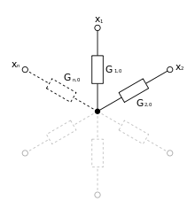 {\displaystyle G_{s}=\sum _{i=1}^{n}{G_{i,0}}}. Hierbei ist {\displaystyle G_{i,j}} der Leitwert des Widerstands vom Anschluss X_{i} zum Anschluss X_{j} in der Polygonschaltung {\displaystyle G_{i,0}} bzw. {\displaystyle G_{j,0}} sind die Leitwerte des Widerstands vom Anschluss X_{i} bzw. X_{j} zum Sternpunkt in der Sternschaltung.