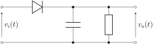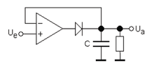 - Bei einem Spitzenspannungsgleichrichter verstärkt ein Komparator[1] die Eingangsspannung so sehr, dass die Schwellenspannung nicht mehr ins Gewicht fällt.