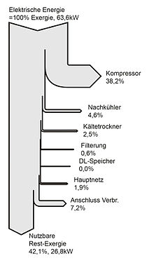 Ein Zustand kann ein bestimmter Punkt in der Wirkungskette sein, also z.B. der Endzustand der Druckluft nach der Komprimierung. Der Vergleich zweier Zustände erlaubt die Berechnung des Exergieverlustes zwischen zwei Zuständen. Setzt man diesen in prozentuale Relation zur Ausgangsenergie, so erhält man den prozentualen Exergieverlust an jeder Station der Wirkungskette. Eine grafische Darstellung der Verluste kann beispielsweise in Form eines Sankey-Diagramms (Abbildung rechts) erfolgen.