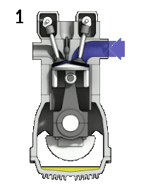 - Takt "Ansaugen" (0➝1): Füllung mit Frischladung