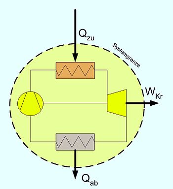 Da nach dem Durchlaufen eines Kreisprozesses das Arbeitsmedium zum Ausgangszustand zurückkehrt, vereinfacht sich die Bilanz. Es entfallen die zeitlichen Änderungen der Zustandsgrößen und es verbleiben die Prozessgrößen Wärme und Arbeit. Gemäß dem Zweiten Hauptsatz der Thermodynamik kann nicht nur Wärme zugeführt werden, die komplett in Arbeit umgewandelt wird, sondern es muss auch Wärme abgeführt werden. Die einfache Bilanzgleichung lautet: