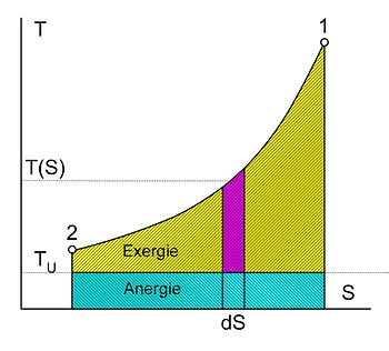 Die thermische Energie eines Systems besteht aus einem Anteil Exergie und einem Anteil Anergie, wobei der exergetische Anteil verschwindet, wenn das System in den Umgebungszustand übergeführt wird.