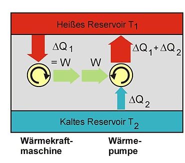 Man könnte damit auch gemäß dem Bild rechts die Wärme aus einem Reservoir oder Behälter entziehen und mit der umgewandelten Energie eine Wärmepumpe antreiben, die mit einem reversiblen Carnot-Prozess Wärme aus einem anderen Behälter mit niedrigerer Temperatur in den Ersteren mit höherer Temperatur fördert. Die in den wärmeren Behälter eingespeiste Wärmemenge wäre dann größer als die von der Kraftmaschine aufgenommene, weil die abgegebene Energie der Wärmepumpe aus der Summe von aufgenommener Wärme und Antriebsarbeit besteht. Denkt man sich die Systemgrenze um beide Maschinen einschließlich der beiden Wärmebehälter gezogen, so wäre innerhalb dieses abgeschlossenen Systems – also ohne Energie- und Stoffaustausch mit der Umgebung – letztlich Wärme von einem kälteren zu einem wärmeren Körper geflossen. Dies ist ein Widerspruch zur ersten Aussage.