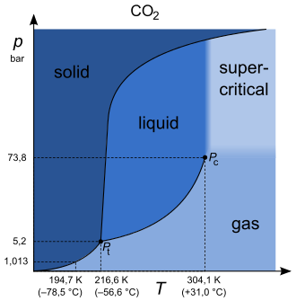 Bei Temperaturen oberhalb der kritischen Temperatur und/oder Drücken oberhalb des kritischen Druckes tritt kein Phasenübergang zwischen flüssiger Phase und Gasphase auf, und es existieren keine Zustände, in denen koexistierende flüssige und gasförmige Phasen vorliegen. Fluide, die bei Temperaturen oberhalb der kritischen Temperatur und/oder Drücken oberhalb des kritischen Druckes vorliegen, werden als überkritisches Fluid oder, in Anlehnung an den betreffenden englischen Ausdruck supercritical, superkritisches Fluid bezeichnet. Da zwischen Flüssigkeit und überkritischem Fluid beziehungsweise zwischen Gas und überkritischem Fluid keine Phasengrenzlinien existieren, bilden Gas, Flüssigkeit und überkritisches Fluid eine einheitliche fluide Phase, die bei niedrigen Molvolumina und Temperaturen sowie hohen Drücken den Charakter einer Flüssigkeit, bei großen Molvolumina und hohen Temperaturen sowie niedrigen Drücken den Charakter eines Gases aufweist. Eine wichtige Eigenschaft von überkritischen Fluiden ist daher, dass diese keine Oberflächenspannung aufweisen. Am kritischen Punkt ist die Oberflächenspannung gleich null. Daraus folgt, dass es oberhalb des kritischen Punktes keinen "Siedeverzug" geben kann.[16]