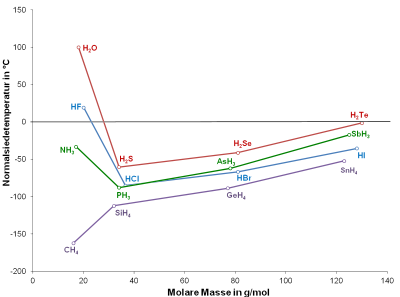 - Die Beobachtung, dass Stoffe einen höheren Siedepunkt haben als ähnliche Stoffe mit höherer molaren Masse, wird als Siedepunktanomalie bezeichnet.
