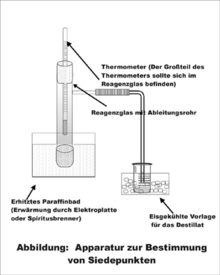 Für einfache Ermittlungen der Siedetemperatur benötigt man ein Reagenzglas (oder einen Kolben) mit einem seitlichen Ansatzrohr mit durchbohrtem Gummistopfen und Thermometer, ein Stück Gummischlauch, ein Glasrohr, ein Paraffinbad, eine Heizquelle und ein Becherglas mit Kühlwanne. Entsprechend der Abbildung Apparatur zur Bestimmung des Siedepunktes wird die eine entsprechende Destillationsvorrichtung aufgebaut.