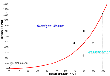 Beispiel: Bei 100 °C und 1013 mbar hat ein Kilogramm Wasser im flüssigen Zustand ein Volumen von 1,04 dm3 und im gasförmigen Zustand ein Volumen von 1,673 m3. Die Wasser-Konzentration in der Gasphase beträgt bei 100 °C dann 598 g/m3 (siehe Dampfdruckkurve).