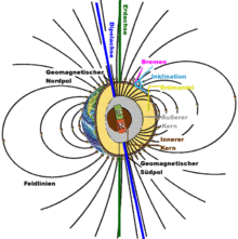 Das die Erde umgebende magnetische Feld wird von einem Geodynamo erzeugt. Das Feld ähnelt nahe der Erdoberfläche einem magnetischen Dipol. Die magnetischen Feldlinien treten auf der Südhalbkugel der Erde aus und durch die Nordhalbkugel wieder in die Erde ein. Im Erdmantel verändert sich die Form des Magnetfeldes. Außerhalb der Erdatmosphäre wird das Dipolfeld durch den Sonnenwind verformt.