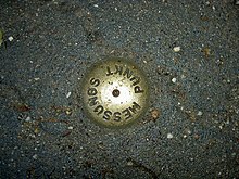 - Bodenmarken in festem Straßenbelag oder auf Gehwegen – meist Bolzen oder Nägel mit der Aufschrift „Vermessungspunkt“ oder „Messpunkt“