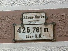 - insbesondere vermarkte Nivellementpunkte (wie Mauerbolzen (MB) oder Höhenmarken (HM) an Kirchen (meist am Kirchturm), Bahnhöfen (meist zur Gleisseite))