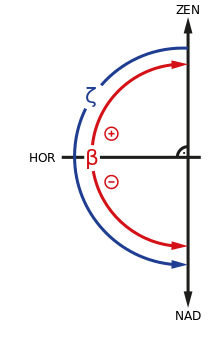 HOR=Horizont, ZEN=Zenit, NAD=Nadir, β=Höhenwinkel, ζ=Zenitwinkel