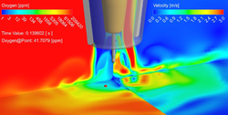 Neben den Methoden der diagnostischen Strömungsanalyse kann die Schutzgasströmung von Schweißprozessen auch mit Hilfe numerischer Strömungssimulation[5] analysiert werden. Vorteile der numerischen Simulation liegen in der Möglichkeit, Strömungen auch in kleinen, verdeckten Bereichen innerhalb des Schweißbrenners zu visualisieren sowie komplexe physikalische Zusammenhänge zeitlich und örtlich hochaufgelöst zu beschreiben. Ursache-Wirkungs-Zusammenhänge können sehr gut erkannt und auf ihre physikalischen Ursachen zurückgeführt werden.[6][7]