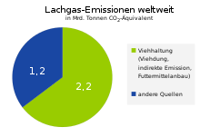 Methan trägt aufgrund seiner hohen Wirkung (25-mal wirksamer als CO2) mit rund 20 % zum anthropogenen Treibhauseffekt bei. Die Verweilzeit in der Atmosphäre ist mit 9 bis 15 Jahren deutlich kürzer als bei CO2. Von der weltweit anthropogen emittierten Methan-Menge (etwa 5,9 Gt CO2-Äquivalent) stammen bis etwa 37 % direkt oder indirekt aus der Viehhaltung. Davon wiederum stammt der größte Teil aus Fermentationsprozessen im Magen von Wiederkäuern. In Deutschland stammten nach Angaben des Umweltbundesamts 2013 rund 54 % der gesamten Methan-Emissionen und über 77 % der Lachgas-Emissionen aus der Landwirtschaft.