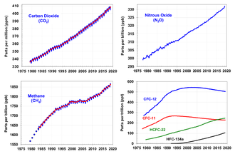 Laut dem Greenhouse Gas Bulletin der Weltorganisation für Meteorologie (WMO) vom Oktober 2021 hat die Menge der Treibhausgase in der Atmosphäre 2020 erneut einen Rekord erreicht, wobei die jährliche Steigerungsrate über dem Durchschnitt der Jahre 2011–2020 liegt. Die Konzentration von Kohlendioxid, dem wichtigsten Treibhausgas, erreichte demnach im Jahr 2020 413,2 Teile pro Million und liege damit bei 149 % des vorindustriellen Niveaus. Die Wirtschaftskrise durch COVID-19 habe demnach keine erkennbaren Auswirkungen auf die atmosphärischen Werte der Treibhausgase und ihre Wachstumsraten, obwohl es einen vorübergehenden Rückgang der neuen Emissionen gegeben habe.