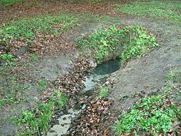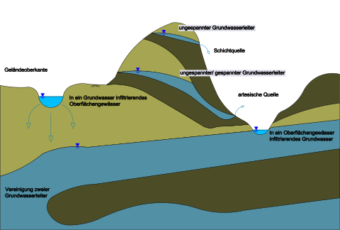 Grundwasser fließt (exfiltriert, entlastet) in einen Vorfluter (Gerinne oder entwässernde Geländesenke) oder tritt in Quellen an der Erdoberfläche aus.