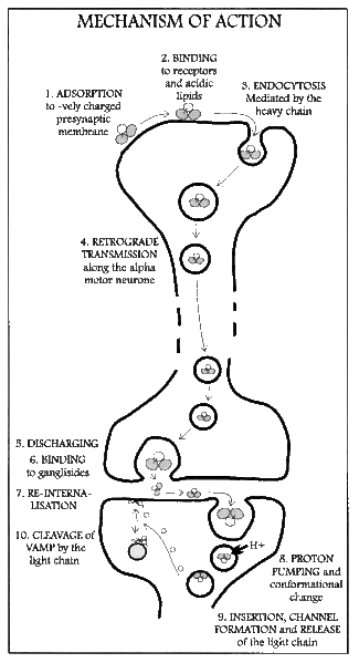 Beide Toxine sind Endopeptidasen. Sie zerstören Proteine, die für die Verschmelzung von synaptischen Vesikeln mit der Membran der Neuronen wichtig sind. Dadurch können die Neurotransmitter nicht mehr in die Intersynapse abgegeben werden. Im Fall von Botulismus wird die Ausschüttung von Acetylcholin (bei Tetanus Glycin) verhindert, was zu Erschlaffung der Muskelfasern führt (bei Tetanus dauerhafte Muskelkontraktion).