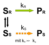 Sind die Geschwindigkeitskonstanten der Überführung der Substratisomere SR und SS in die korrespondierenden Produkte PR und PS verschieden, so ist eine kinetische Racematspaltung möglich. Die Reaktion wird bei einem Umsatz von circa 50 % abgebrochen, da das schneller reagierende Enantiomer verbraucht ist. Im Reaktionsgemisch reichert sich das langsamer reagierende Enantiomer an. Die Komponenten SS und PR können mit herkömmlichen Methoden getrennt werden, PR kann nach erfolgter Trennung gegebenenfalls wieder in SR überführt werden.