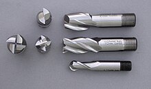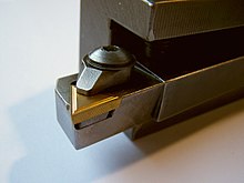 Hartmetalle sind durch Sintern hergestellte Verbundwerkstoffe. Sie bestehen aus einer weichen metallischen Bindephase (meist Cobalt) und den darin eingelagerten harten Carbiden Titan-, Wolfram-, Tantalcarbid oder Titannitrid.[5] Die Abkürzungen lauten HW für überwiegend aus Wolframcarbid, HT (Cermets) für überwiegend aus Titancarbid und Titannitrid bestehende Hartmetalle und HC für beschichtete Varianten. Die Härte und Zähigkeit ist abhängig von der Zusammensetzung der Carbide mit einer Größe von 1–10 µm und dem weichen Bindemittel, das in der Regel einen Volumenanteil bis 20 % einnimmt, wobei mehr Bindemittel die Schneide weicher und zäher macht.[6] Hartmetallschneidstoffe können neben Stahl und Gusseisen auch harte Werkstoffe wie Glas und Porzellan spanend bearbeiten. Sie werden meist in Form von Wendeschneidplatten eingesetzt, es gibt sie aber auch als Werkzeuge aus Vollhartmetall oder als eingelötete Hartmetall-Schneidplatten auf Werkzeugkörpern aus Stahl (Betonbohrer).