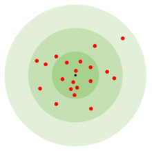 Eine Näherung unter Annahme von normalverteilten Einschlägen mit höchster Trefferdichte im Ursprung des Koordinatensystems erhält man durch folgendes Doppelintegral: