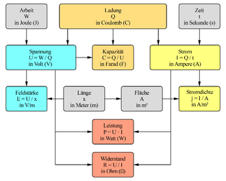 - Die elektrische Ladung. Sie ist eine Eigenschaft bestimmter atomarer Teilchen wie der negativ geladenen Elektronen und der positiv geladenen Protonen, die als Ladungsträger bezeichnet werden, und wird in der Einheit Coulomb gemessen. Die Bezeichnung positiv bzw. negativ ist willkürlich gewählt. Wesentliche Eigenschaft ist, dass sich gleichnamige elektrische Ladungen abstoßen, während sich ungleiche Ladungen anziehen.