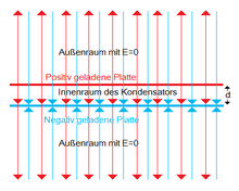 Eine positiv geladene, sehr große Ebene trage pro Flächeneinheit die Ladung Q. Das entspricht der Ladungsdichte σ = Q/A. Im Abstand d verläuft eine parallele Ebene der Ladungsdichte -σ. Diese Anordnung wird auch als Plattenkondensator bezeichnet. Um Polaritäten unterscheiden zu können, wurde vereinbart, dass die Feldlinien von der positiven Platte weg zeigen (rot eingezeichnet) und zur negativen Platte hin zeigen (blau eingezeichnet).