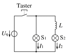 Animation eines Gleichstromkreises: Nach dem Schließen des Tasters leuchtet S1 sofort auf, während sich die Helligkeit von S2 aufgrund der dem Stromfluss entgegenwirkenden Selbstinduktion der Spule L nur allmählich erhöht.