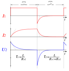 Stromfluss durch Lampen S1 und S2 sowie die an der Spule L anliegende Spannung U2 im zeitlichen Verlauf. Die feinen, schräg verlaufenden Geraden veranschaulichen die Zeitkonstanten \tau 1 und \tau 2.