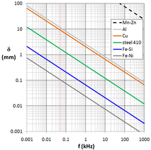 Frequenzabhängige Eindringtiefe (Abfall auf 1/e, ca. 37 %) in einer Kupferleitung[4] Frequenz Eindringtiefe Frequenz Eindringtiefe 5 Hz 29,7 mm 5 MHz 29,7 µm 16 Hz 16,6 mm 16 MHz 16,6 µm 50 Hz 9,38 mm 50 MHz 9,38 µm 160 Hz 5,24 mm 160 MHz 5,24 µm 500 Hz 2,97 mm 500 MHz 2,97 µm 1,6 kHz 1,66 mm 1,6 GHz 1,66 µm 5 kHz 938 µm 5 GHz 938 nm 16 kHz 524 µm 16 GHz 524 nm 50 kHz 297 µm 50 GHz 297 nm 160 kHz 166 µm 160 GHz 166 nm 500 kHz 93,8 µm 500 GHz 93,8 nm 1,6 MHz 52,4 µm 1,6 THz 52,4 nm