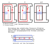 Zusätzlich dringen die Streufelder auch in die Wicklungsdrähte ein und induzieren dort Wirbelströme. Es entstehen zusätzliche Leitungsverluste und damit Wärme, die elektrische Güte verschlechtert sich und bei Leistungsanwendungen kann durch die Temperaturerhöhung das Bauteil zerstört werden. Diese Wirbelströme treten bei Streufluss zusätzlich zum Proximity-Effekt auf.