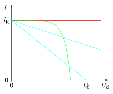 Da das Modell der linearen Quelle auf dem Modell der idealen Quelle aufbaut, steigt bei der linearen Quelle die Kennlinie bei Leistungsaufnahme mit gleicher Steigung nach links weiter an auf Werte größer als der Kurzschlussstrom.