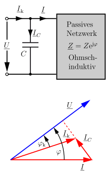 Die folgende Betrachtung bezieht sich auf sinusförmige Spannung und auf Verbrauchsmittel mit sinusförmiger und daher oberschwingungsfreier Stromaufnahme. Durch die Kompensationsanlage pendelt der Blindstrom zum großen Teil nur zwischen Verbrauchsmittel und Kompensationsanlage. Das Versorgungsnetz wird entlastet; in nebenstehendem Diagramm ist der Zeiger für {\displaystyle I_{\mathrm {k} }} kürzer als für I.